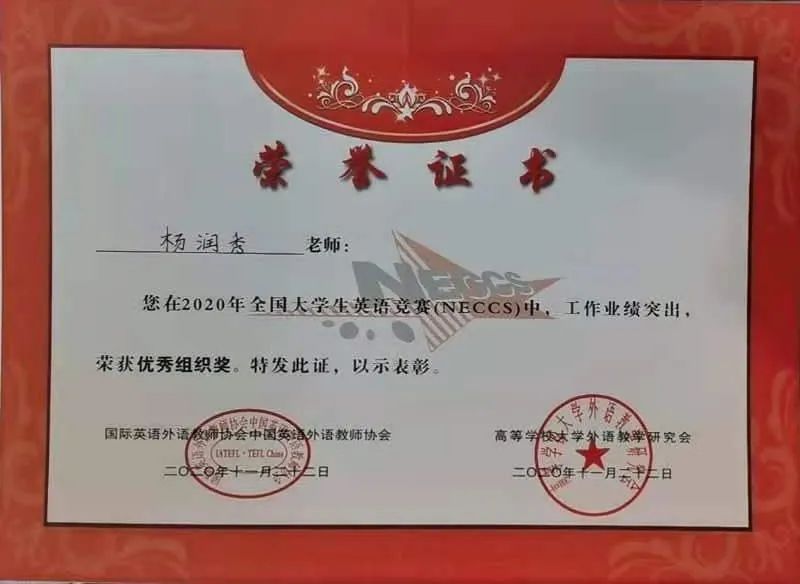 我院副院长杨润秀教授在高等学校大学外语教学研究会主办的2020年全国大学生英语竞赛中(NECCS)中,工作业绩突出,荣获优秀组织奖,特此祝贺!