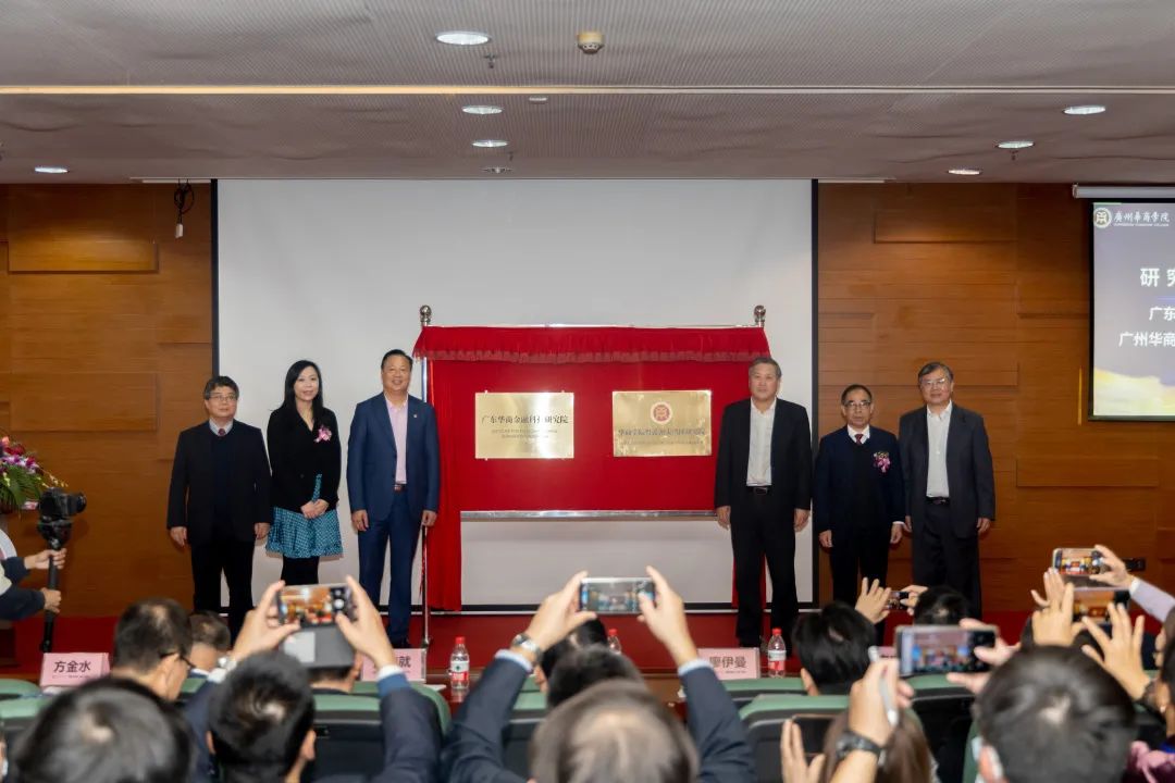 大会同日,首届华商金融科技论坛开幕式暨广东华商金融科技研究院揭牌仪式在中央图书馆学术报告厅举行。 华商学院领导共同为广东华商金融科技研究院、华商学院粤港澳大湾区研究院揭牌。