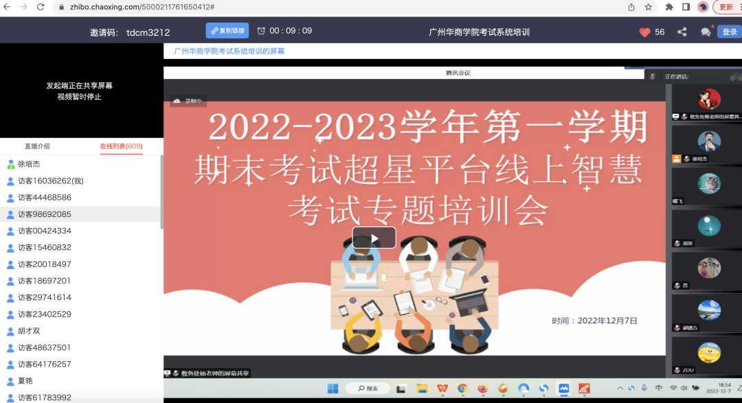 为帮助教师熟练使用华商学院网络教学平台(学习通)在线考试模块的相关功能,2022年12月7日晚,教务处邀请超星集团讲师,通过腾讯会议和超星直播平台,为我校两校区近1400名任课教师、行政教辅、辅导员等开展学习通线上考试系统培训,教务处考务科杨老师主持线上培训会。