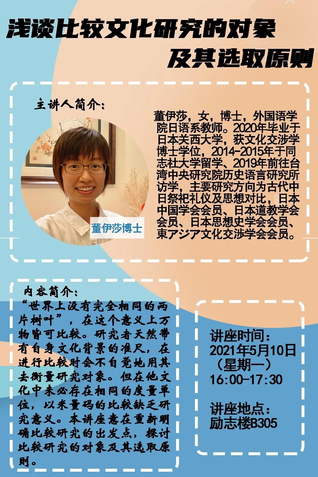 董伊莎,女,博士,伟德国际VICTOR1946日语系教师。2020年毕业于日本关西大学,获文化交涉学博士学位,2014-2015年于同志社大学留学、2019年前往台湾中央研究院历史语言研究所访学,主要研究方向为古代中日祭祀礼仪及思想对比,日本中国学会会员、日本道教学会会员、日本思想史学会会员、東アジア文化交涉学会会员。