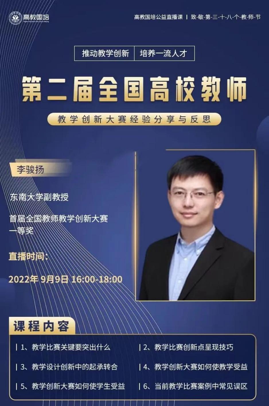 李骏扬——东南大学,首批国家级混合式一流课程负责人,首届全国高校教师教学创新大赛一等奖、教学设计创新奖、教学学术创新奖获得者,江苏省教学成果一等奖,江苏高校微课教学比赛(课程思政)一等奖;