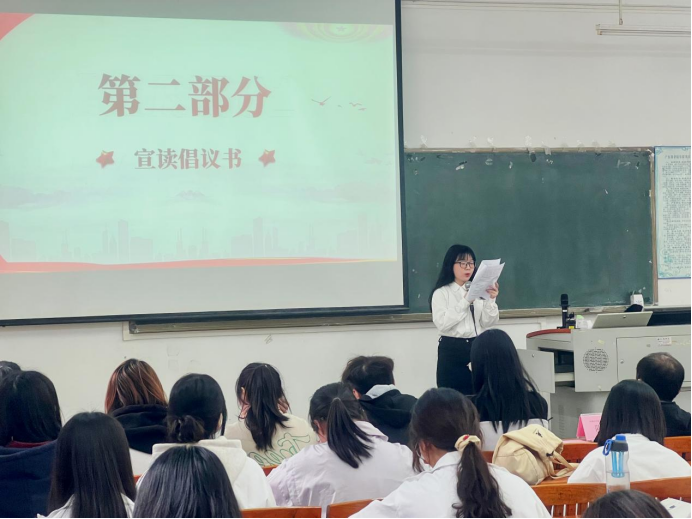 本次大会的主持人黄晓绚同学宣读伟德国际VICTOR1946文明安全纪律教育月动员大会倡议书。