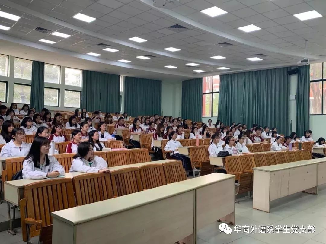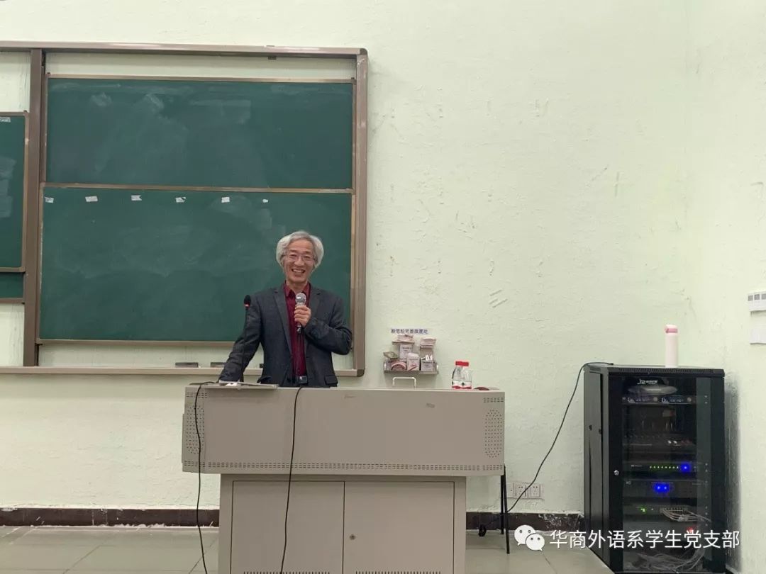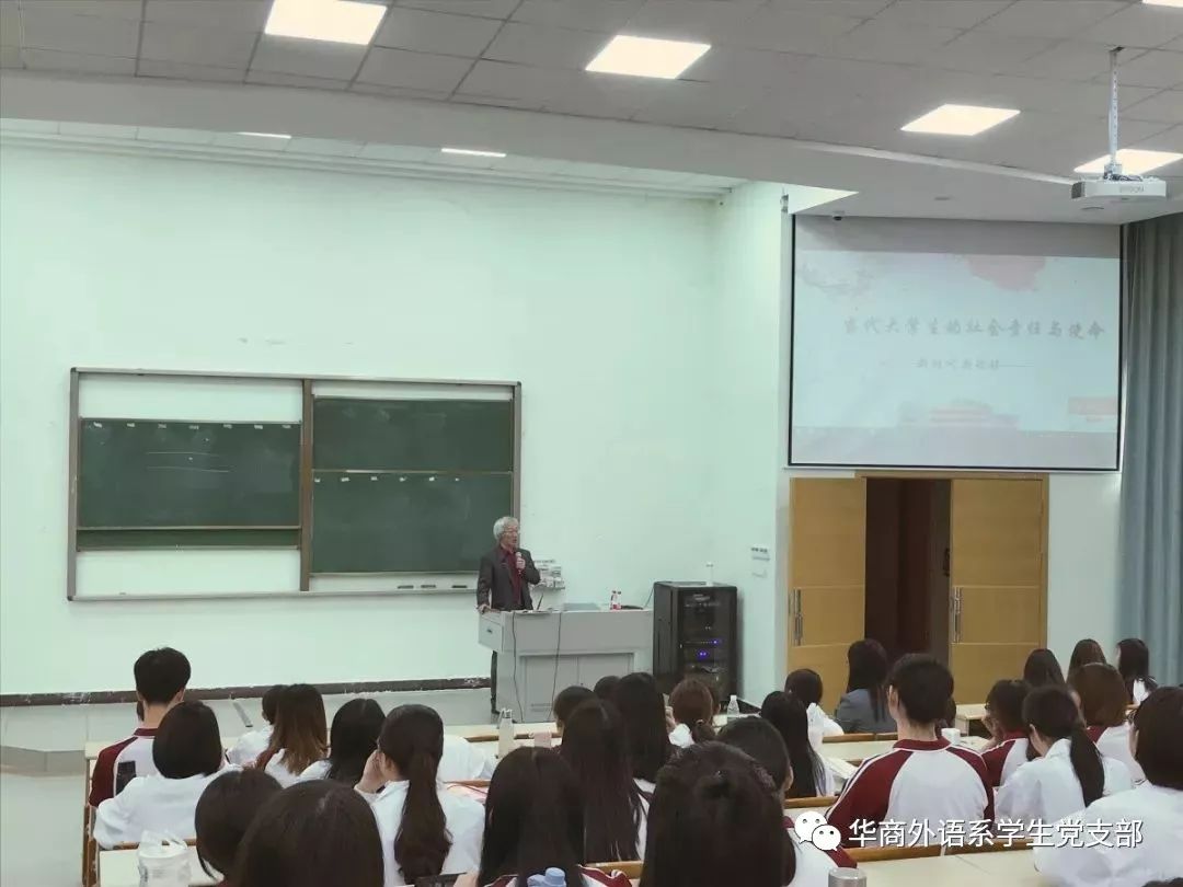 王琢教授在党课开始时讲述了学校在培育人才方面的社会责任,例举了华商学院近年来的变化,学校硬件设备不断更新,师资力量不断壮大,将履行社会责任融入到学校的发展中。王教授希望外语系同学们珍惜学校引进的外教资源,努力学好专业知识,以一技之长在社会立足。他还提到大学生在就业时的优势以及一些优秀毕业生的事例,鼓励同学们要认真学习专业知识,追求更高层面的学问知识,用敬畏的精神学习更多知识。