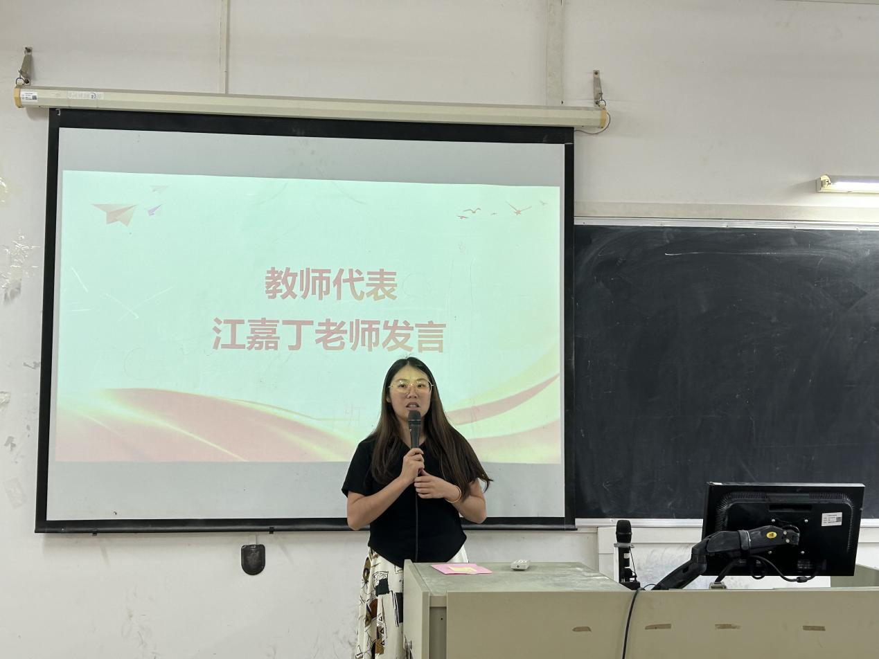 在教师代表发言环节,江嘉丁老师向同学们做了三个提醒。一、宿舍安全,不使用违规电器及用品;二、交通安全,校内注意过往车辆,校外遵守交通规则;三、财产安全,正确使用网路,防止上当受骗。她提醒同学们在日常的学习、工作、生活中,一定要提高安全意识,做好自我保护。