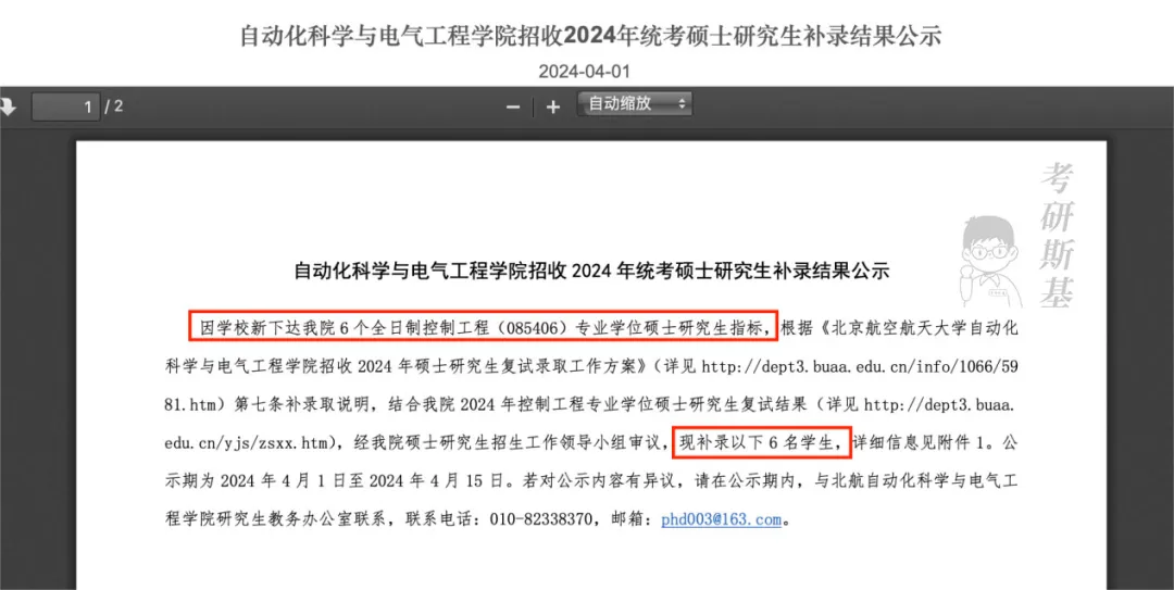 自动化科学与电气工程学院发布招收2024年统考硕士研究生补录结果公示:因学校新下达我院6个全日制控制工程(085406)专业学位硕士研究生指标,结合复试结果补录6名同学。