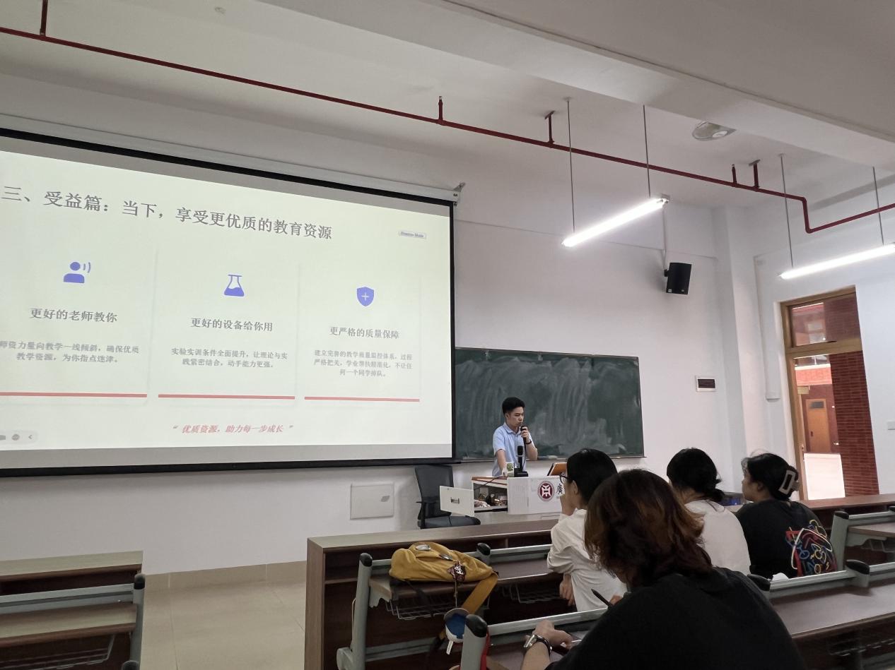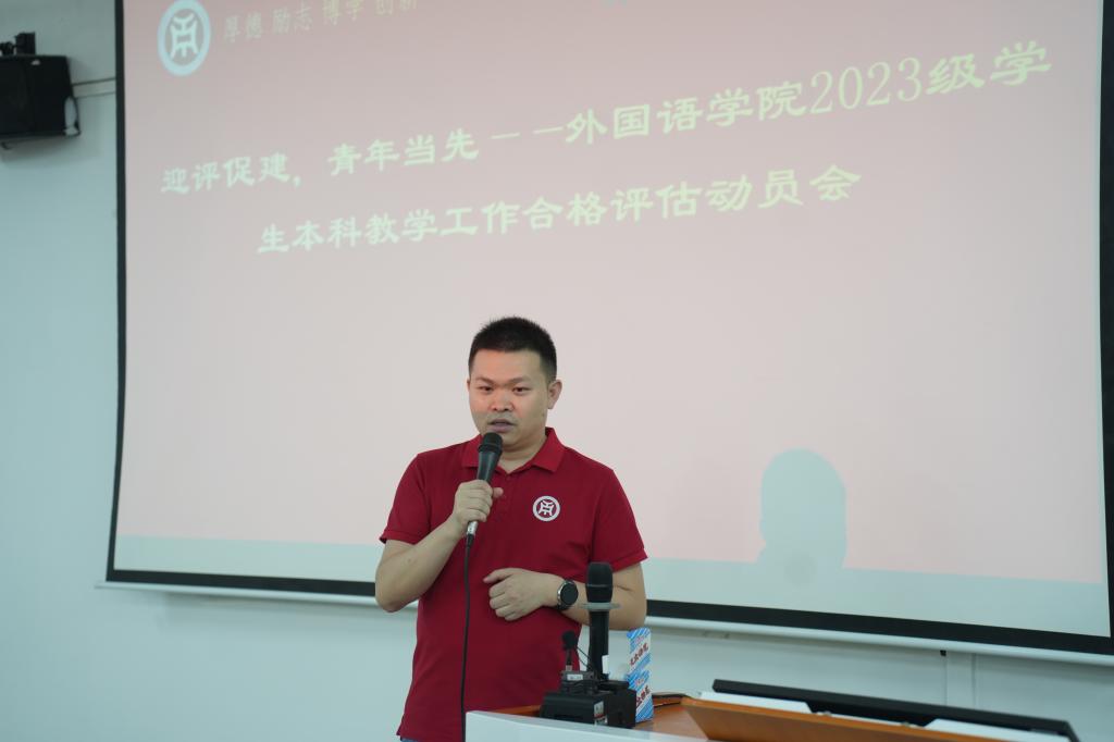 他强调,本科教学合格评估不仅是对学校办学水平和人才培养质量的全面检验,更是推动学院内涵发展、产教融合发展以及提升综合竞争力的重要契机。肖坤学院长为同学们更好地迎接合格评估提出三点要求:第一,争做勤学笃行的表率,带头遵守课堂纪律;第二,做迎评参与者,落实文明规范,学习评估知识;第三,做文明风尚的榜样,积极参与“亮身份、践承诺、树标杆”活动。