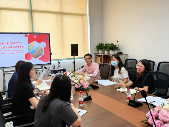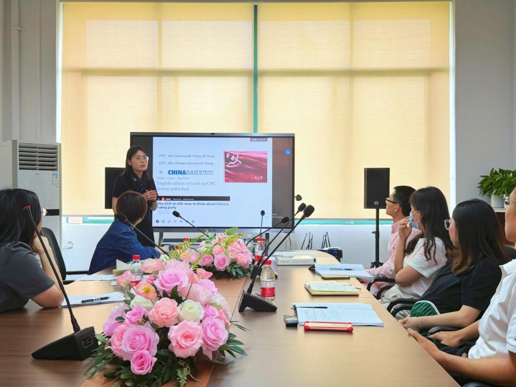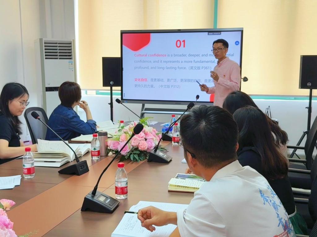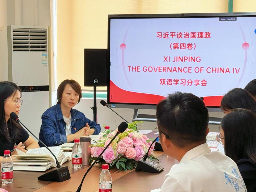 组宣委员谢瑶同志分享了自己对文化专题学习的感悟,尤其就“中国共产党”一词的英译与大家展开探讨。她指出,双语学习项目不仅可以帮助师生了解中国时政话语体系,还能从研读《习近平谈治国理政》英文版来加深我们对中文表述的理解,体现了双语学习在提升语言能力与文化理解方面的双重价值。